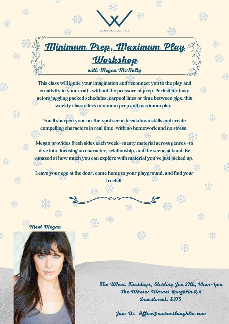 If you are accepted into the Studio, and are an Intermediate or Advanced actor, you’ll begin your journey in the Warner Loughlin Technique Intensive. Here you’ll discover powerful ways to unlock your creativity. In this 3 week intensive dive, we’ll take you through each of the practical steps of the Technique. This interactive workshop guides you through scene breakdown and intuitive/imaginative character building culminating in putting up a scene of your choosing. Get ready to dive more deeply into a character than you ever thought imaginable.
