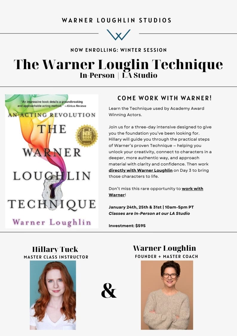 With thousands of productions across the country and the world, you can be a successful actor no matter where you live, and we’re here to help. The Warner Loughlin Technique Online Intensive will jump start your journey into diving deeply into characters, strengthening your choices with practical and doable instruction and breaking scenes down through an emotionally powerful lens. At the end of this intensive you’ll get up on your feet with a scene of your own choosing.